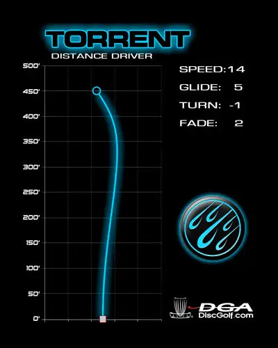 The DGA Torrent is a very fast and stable distance driver geared towards max distance throws for both backhand and forehand. It will provide a decent amount of high speed turn while also having a predictable fade.