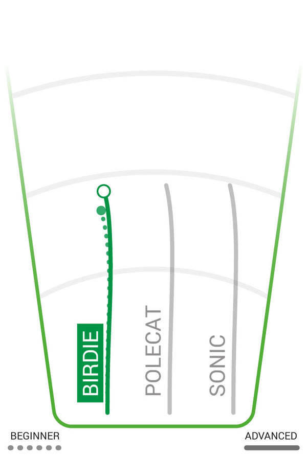 The Birdie is a slow, straight flyer with our Thumtrac® grip for a sure release. It has great chain catching ability. Great for approach shots, as it flies straight and slow, start to finish. It is one of our best “go for it” discs as it doesn’t go far past the basket on misses, and stays put when it hits the ground. A good disc for those players making the conversion from flat edged disc sports: Catch, Ultimate, Freestyle, etc.